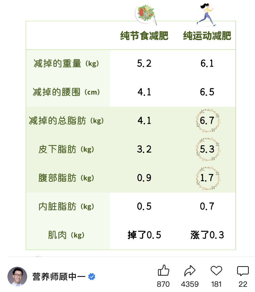但有研究尝试让一群人只运动不少吃,结果发现,这组人3个月体重只减轻了1斤,但是他们的腰围减了3.1厘米。“丁香医生”发文称,很多同类型研究都有相似的发现,运动即使体重不变,维度都会有较大的改善,甚至还能改善胰岛素抵抗、空腹血糖,效果让人刮目相看。如果你追求的是体重秤上的数字变小,那饿瘦看起来会更高效。但如果你真的是想要减肥、变瘦、显身材,运动能带来扎实的效果。一组每天少吃500大卡热量而不运动,另一组每天通过运动消耗500大卡热量(约1小时)而不少吃这一观点也得到了营养师顾中一的认可,如果你只追求短期快速降低体重数字,那少吃效果更快,但从长期健康减重角度还是劝你运动,毕竟减肥从来不是一时的事,而是一种生活方式。![]()